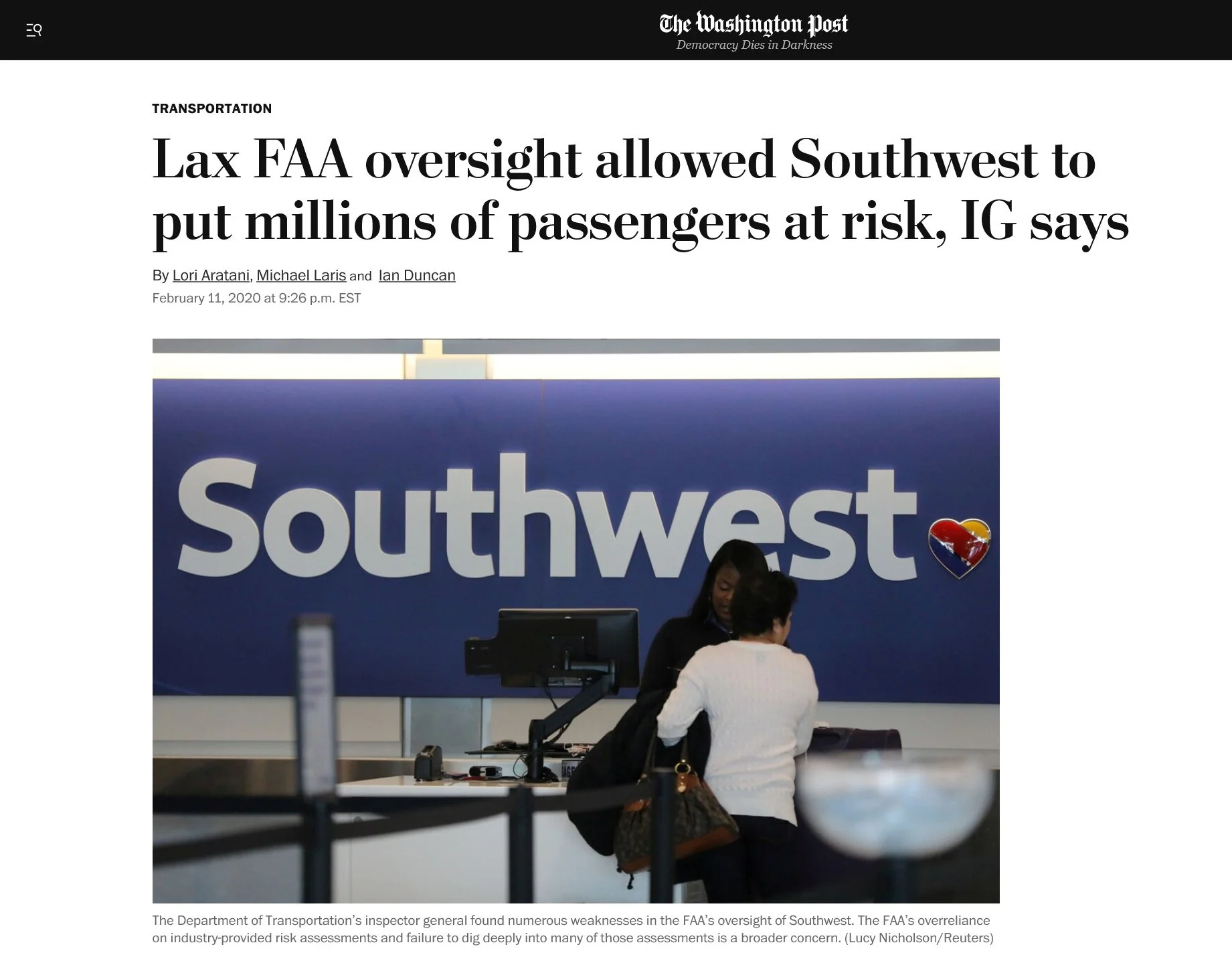 Lax FAA Oversight Allowed Southwest to Put Millions of Passengers at Risk: Washington Post, Feb. 11, 2020
